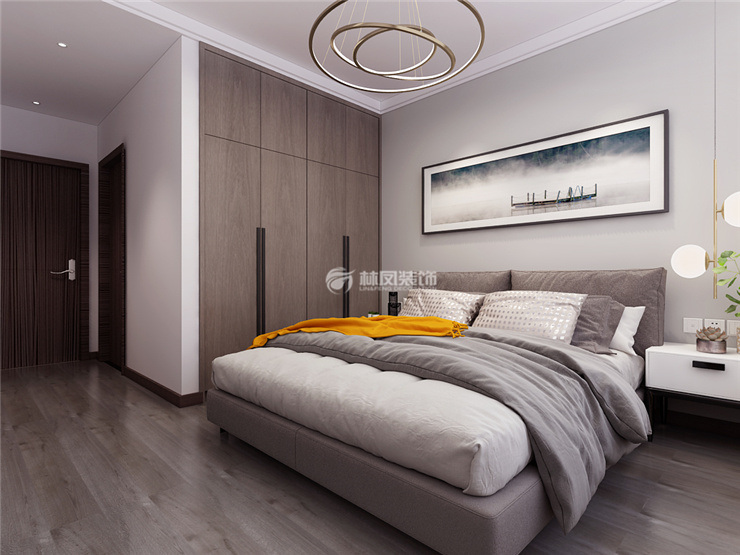 金輝優(yōu)步學(xué)府112㎡三室兩廳林鳳裝飾的臥室以深色的衣柜搭配灰色的布藝床,搭配木色地板,讓空間看起來不那么冰冷。主臥室也有單獨的衛(wèi)生間空間,讓房主使用起來更加方便。臥室里還預(yù)留了投影儀,后期在使用上也很方便忙。
