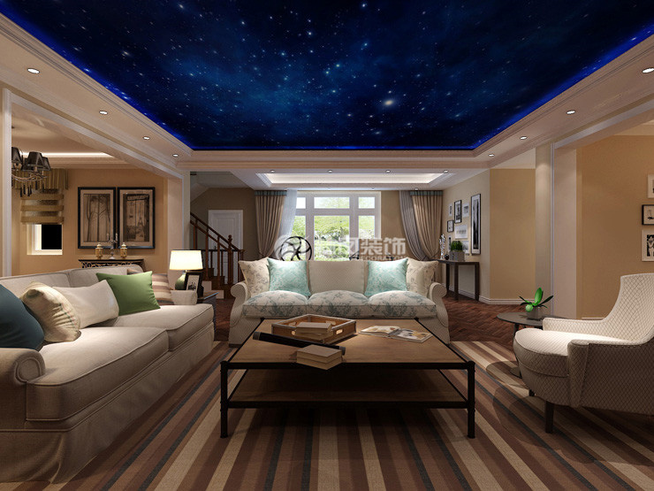 錦園450平別墅美式風(fēng)格林鳳裝飾的客廳以文化石作為背景墻,文化石肌理偏向舒適,整體色彩土黃色,配合實木色彩,材質(zhì),沉靜,大氣。