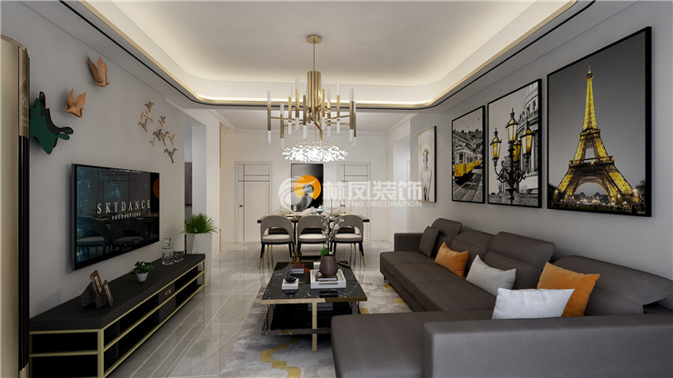金輝優(yōu)步湖畔115平四室兩廳現(xiàn)代簡(jiǎn)約風(fēng)格林鳳裝飾的客廳以灰色和黑色進(jìn)行銜接,客廳地面選用灰色的地磚與棚面采用了吊棚含燈帶部位加上了金屬線條,采用深灰色布藝沙發(fā)和灰色背景墻整體設(shè)計(jì)上都要求給人帶來(lái)大氣簡(jiǎn)約又很內(nèi)斂的感覺,簡(jiǎn)約的空間布局讓人感覺更加通暢。