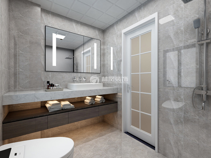 金輝優(yōu)步學府110平三室兩廳現(xiàn)代風格林鳳裝飾的衛(wèi)生間運用灰色大理石瓷磚,洗手臺大理石與墻地面的大理石瓷磚渾然一體,擴大了視覺空間,有一種淡雅質(zhì)感的氣息。