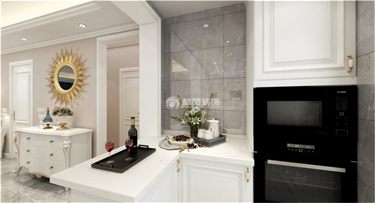 金地樾檀山180平四室兩廳歐式風(fēng)格林鳳裝飾的廚房分為中廚和西廚,中廚采用拉門,使得空間更加寬敞明亮,在顏色的選擇上,整體以白色為主,和客廳的色系整體呼應(yīng),達(dá)到良好的視覺效果。