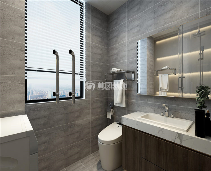 保利香檳裝122平三室兩廳港式輕奢風(fēng)格林鳳裝飾的衛(wèi)生間灰色調(diào)的主色搭配暖調(diào)的燈光、空間既溫和又港式奢華的韻味。大氣 有質(zhì)感,有一種神秘感。