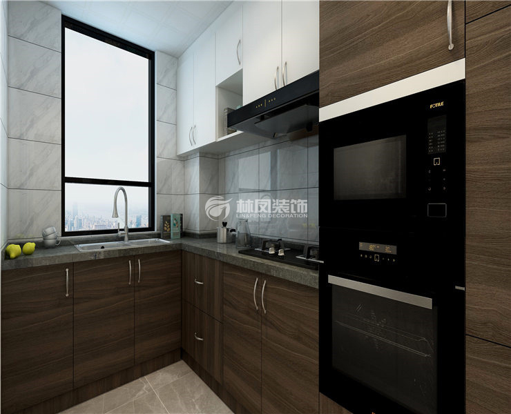 保利香檳裝122平三室兩廳港式輕奢風(fēng)格林鳳裝飾的U型櫥柜最大化增加廚房使用面積,深木色的柜體和淺色的臺(tái)面讓廚房更具有層次感,整個(gè)空間看著干凈整潔又不失大氣穩(wěn)重。