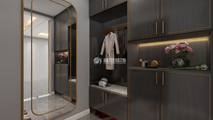 融創(chuàng)中央學(xué)府132平三室兩廳現(xiàn)代輕奢風(fēng)格林鳳裝飾的玄關(guān)