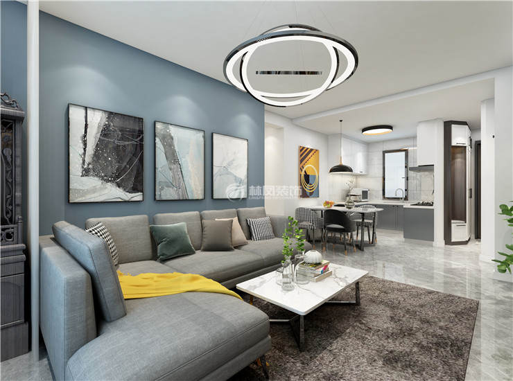 碧桂園繁華里100平兩室兩廳現(xiàn)代風(fēng)格林鳳裝飾的客廳沙發(fā)背景采用湖藍(lán)色的壁紙,將客廳空間獨(dú)立出來,并用L型灰色系的沙發(fā)與電視背景墻壁紙通過色彩來呼應(yīng),看起來大氣,柔和。