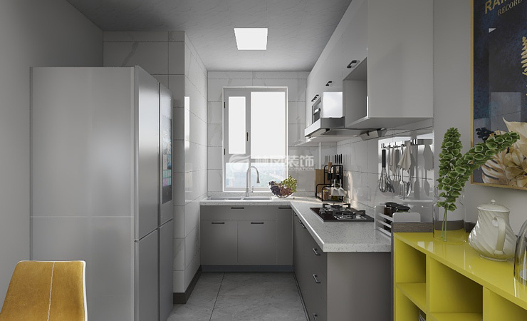 富景學(xué)府新城78平兩室兩廳現(xiàn)代風(fēng)格林鳳裝飾的廚房采取開放式,讓空間更通透明亮。