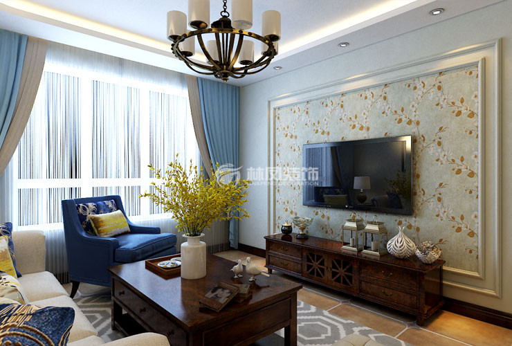 本案戶型客廳主要作用是滿足客戶生活起居,家具上選擇了布藝的沙發(fā),深木色實(shí)木的茶幾、角幾,裝修上采用了弧形造型加上彩色壁紙與石膏線搭配的背景墻設(shè)計(jì),主要目的就是把美式風(fēng)格的一些特點(diǎn)體現(xiàn)出來。