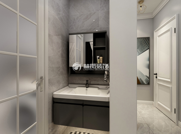 紫堤?hào)|郡132平三室兩廳現(xiàn)代風(fēng)格林鳳裝飾的衛(wèi)生間的干濕分離設(shè)定,剛開始業(yè)主還不是很能接受,當(dāng)方案出來那一刻,客戶深深感到分出來的洗手盆的重要功能,為來到的客人提供很大的方便。