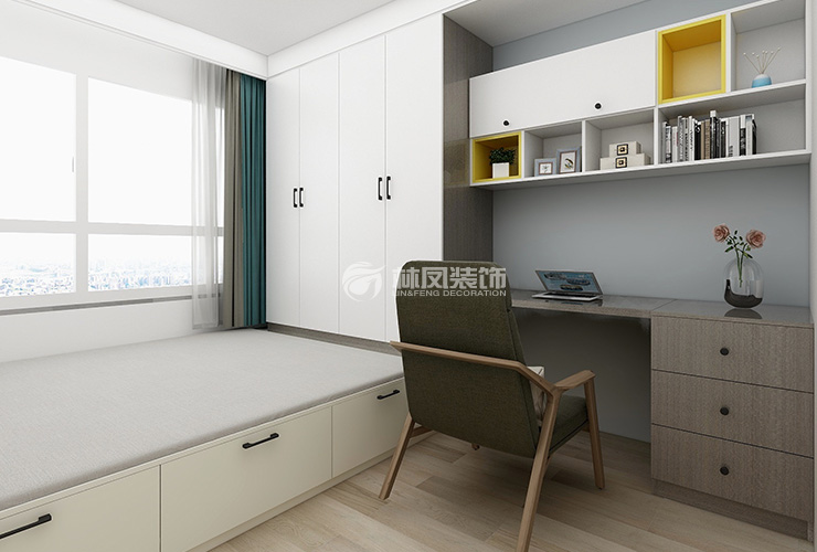 【主臥室說(shuō)明】背景墻以業(yè)主喜歡的灰色調(diào)為主,用軟裝,配飾搭配顏色,配合現(xiàn)代感強(qiáng)的床品和床頭柜,整體感覺(jué)完整,不突兀?!敬闻P室說(shuō)明】次臥室布置成榻榻米,給原本收納空間不太足屋子增加了收納功能,休息、辦公空間得到雙向滿足。充足利用了客臥的空間。
