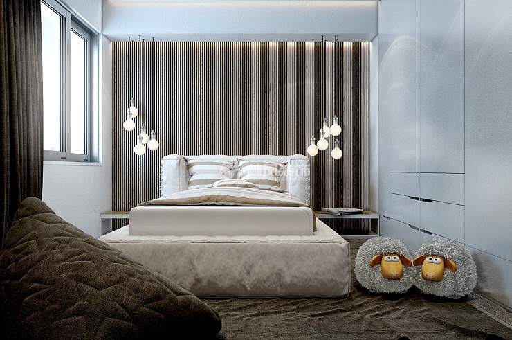 遠(yuǎn)洋天地140平三室兩廳現(xiàn)代輕奢風(fēng)格林鳳裝飾的主臥室與客廳風(fēng)格同一,輕奢感十足,使用軟包搭配線條來體現(xiàn)質(zhì)感,女業(yè)主尤為滿意。