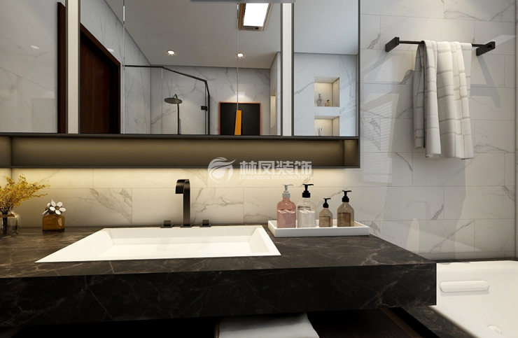 衛(wèi)生間打造新中式風(fēng)格,融入現(xiàn)代感與古老結(jié)合的元素,深胡桃木色浴室柜,為衛(wèi)生間烘托新中式的韻味,浴室柜智能境環(huán)繞的氛圍燈