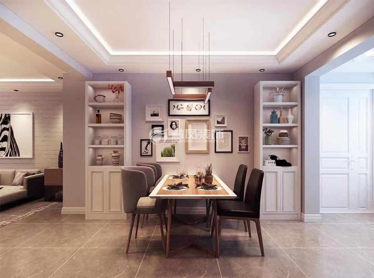 餐廳上方采用單獨(dú)的吊頂,兩邊采用定制柜的形式增加了就餐區(qū)的收納