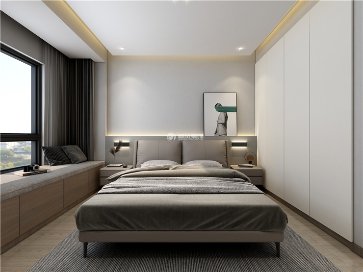 主臥背景墻采用灰白色乳膠漆進(jìn)行點(diǎn)綴,灰色的床與背景墻相結(jié)合,使其風(fēng)格更加突出于設(shè)計(jì)師的高明之處。