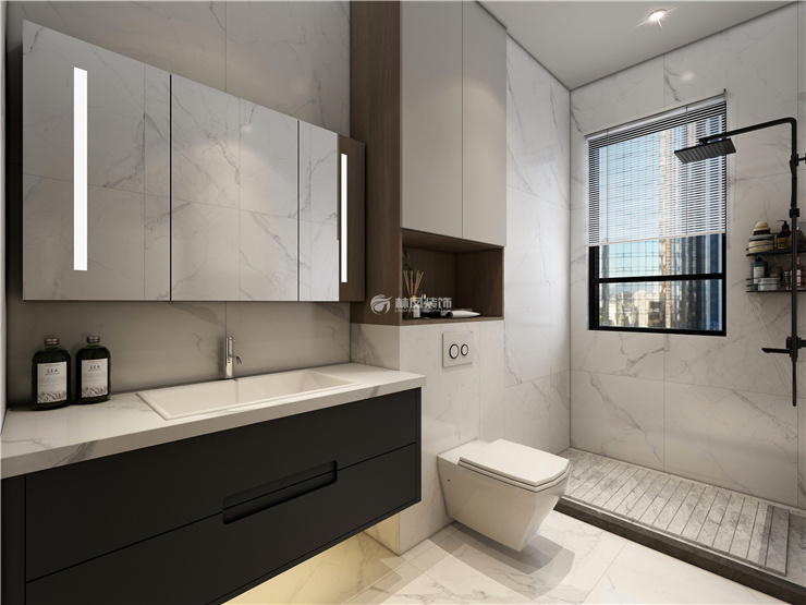 衛(wèi)生間瓷磚為淺灰材質(zhì),獨(dú)立的淋浴區(qū)采用黑色材質(zhì),高級(jí)感上升,體現(xiàn)出業(yè)主高端的氣質(zhì)感。