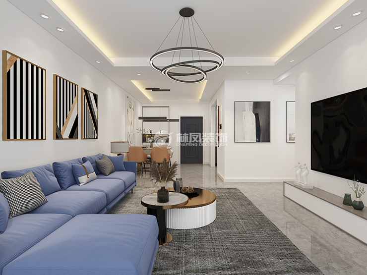 客廳整體色調(diào)黑白為主,藍(lán)色沙發(fā)與主色調(diào)形成對(duì)比,簡(jiǎn)潔大方,搭配暖色燈給人以家的溫馨之感。