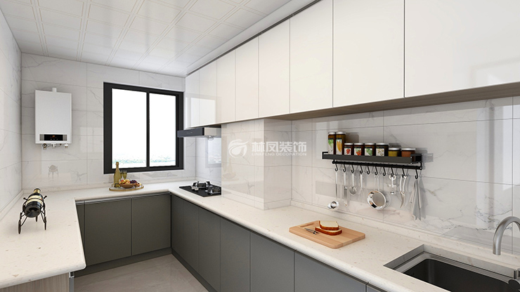 廚房采用的是u型櫥柜空間利用性達(dá)到最大 ,超大的臺(tái)面可擺放的物也更多,AB版的櫥柜灰色與白色的搭配也是當(dāng)今最流行的搭配。