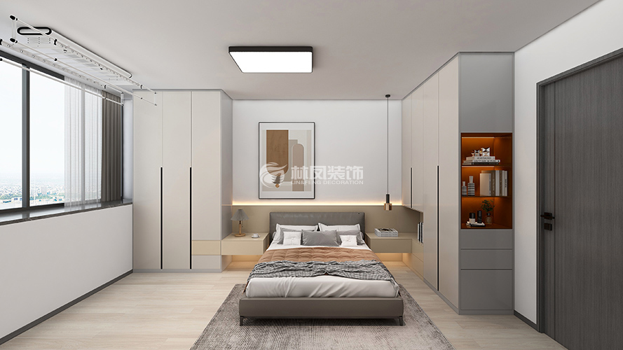 主臥空間較大,設(shè)計(jì)U型的衣帽間,增加儲(chǔ)物,主臥陽臺(tái),添置書柜,放置主人喜愛的手辦等,簡約大氣。