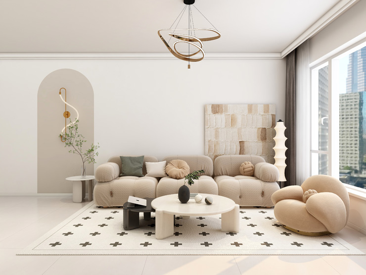 客廳說明:客廳空間墻面大面積留白,在過廊正面對的墻面做了曲線的乳膠漆調(diào)色區(qū)域,柔和的色彩以及曲線的造型,是奶油風的基礎(chǔ)元素,也為空間注入了時尚與溫度。