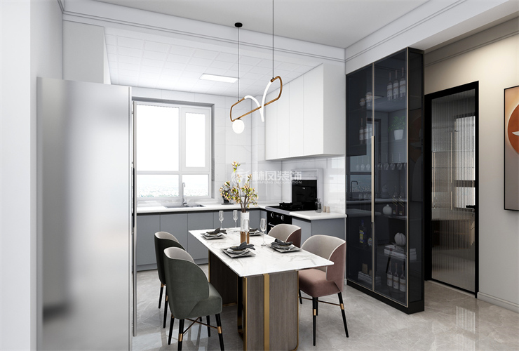 餐廳說(shuō)明:餐桌臨近廚房;搭配簡(jiǎn)單餐吊.餐邊柜與電視背景墻色調(diào)一致.