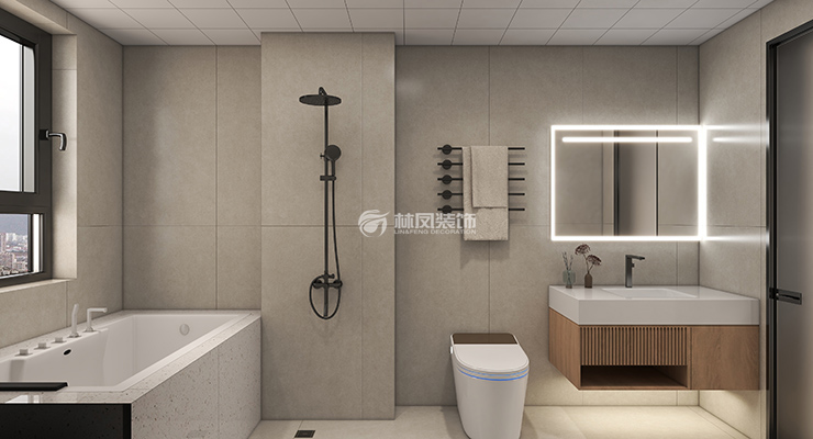 衛(wèi)生間說明:衛(wèi)生間采用的暖灰色大板磚,配合木色的浴柜,讓原本感覺比較冷的空間,變的溫馨起來。