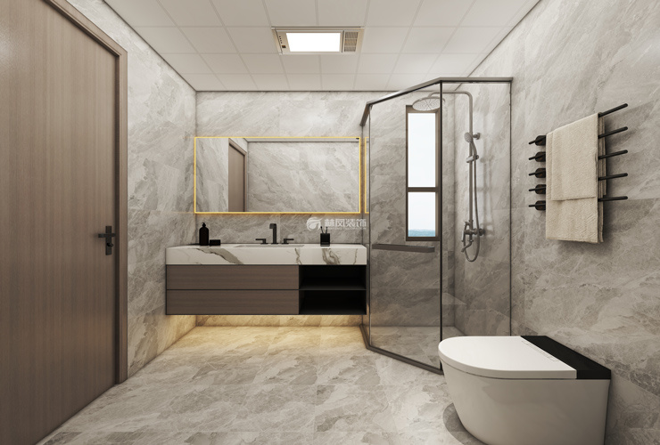 衛(wèi)生間說明:衛(wèi)生間墻面鋪設(shè)大理石紋路瓷磚,使空間呈現(xiàn)高檔大氣的效果,洗漱柜為白色理石臺面溫馨且好打理。