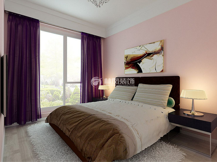 主臥室以暖色為基礎(chǔ)色調(diào),在家具的選用上也運用淺顏色,但是在一些配飾上采用了耦色,給人煥然一新的感覺。