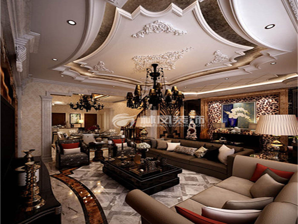 客廳棚面做的較為復(fù)雜,每個(gè)棚的立面都運(yùn)用了金箔做修飾,與家具的金飾線條搭配起來(lái),很是融合,墻面多用軟包材質(zhì)做修飾,增添貴族氣息,地面的理石拼花更是采用與棚面呼應(yīng)的線條,使整個(gè)空間,不管是在顏色還是線條方面都具有十足的法式氣息。