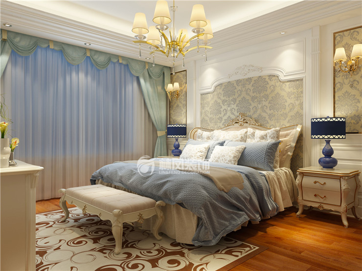 臥房整體用色以淺駝色,淡色為主,視覺(jué)效果比較柔和,十分溫暖的空間,床頭與尾凳使用的是同一種面料的軟包,彰顯出了歐式風(fēng)格的高雅,床頭背景墻皆運(yùn)用壁紙與護(hù)墻板、石膏線(xiàn)組合,豐富了臥室空間,展現(xiàn)歐式魅力。