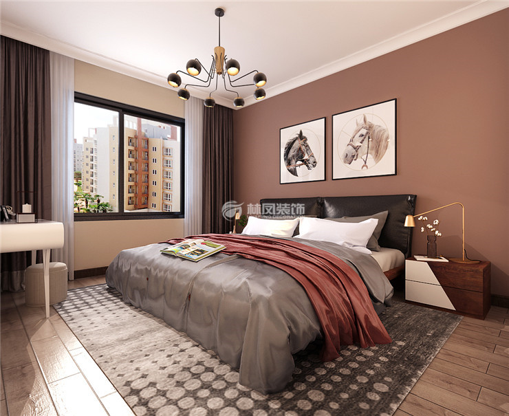 三室兩廳一廚兩衛(wèi),高層整體采用美式風(fēng)格,色調(diào)以深色為主,體現(xiàn)美式的居家感和溫馨感。