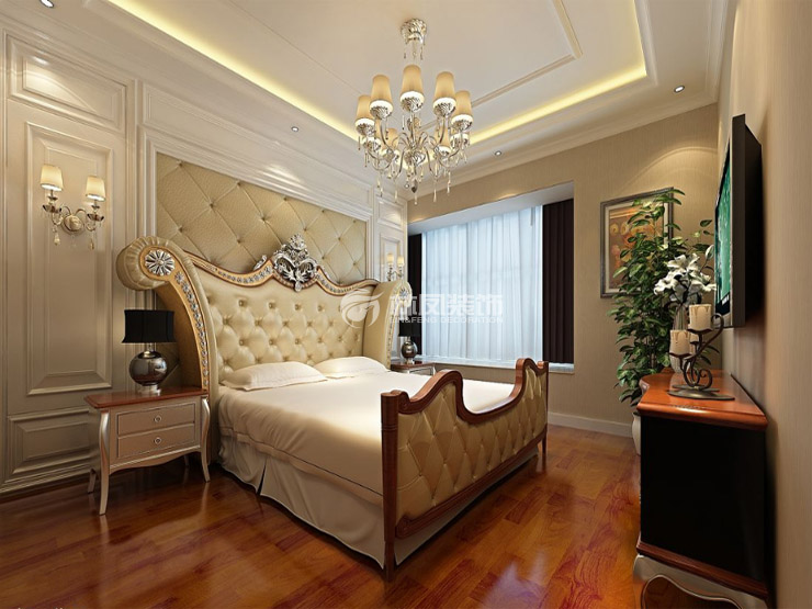 主臥室采用深色地板,床頭背景采用象牙白墻板的設(shè)計(jì)高貴大氣,內(nèi)嵌的軟包造型出與線條,床品的顏色也和窗簾配飾相呼應(yīng)。棚面采用邊棚和歐式石膏線相結(jié)合,并采用筒燈和燈帶增加氛圍光。