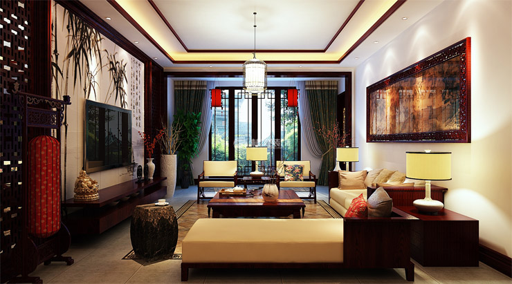 客廳空間比較大,所有木作材質(zhì)和顏色都與家具一致做紅木色,靠墊為絲綢與亞麻,背景墻用的三分手法把中間的背景墻達(dá)到完美比例,其余兩側(cè)做實(shí)木花格,底稱銀鏡增加層次和通透感,中間背景墻用潑墨山水配書(shū)法。光源沒(méi)有以輔助光源為主,中間僅做了兩個(gè)小鳥(niǎo)籠燈,增加客廳情趣和玩味。