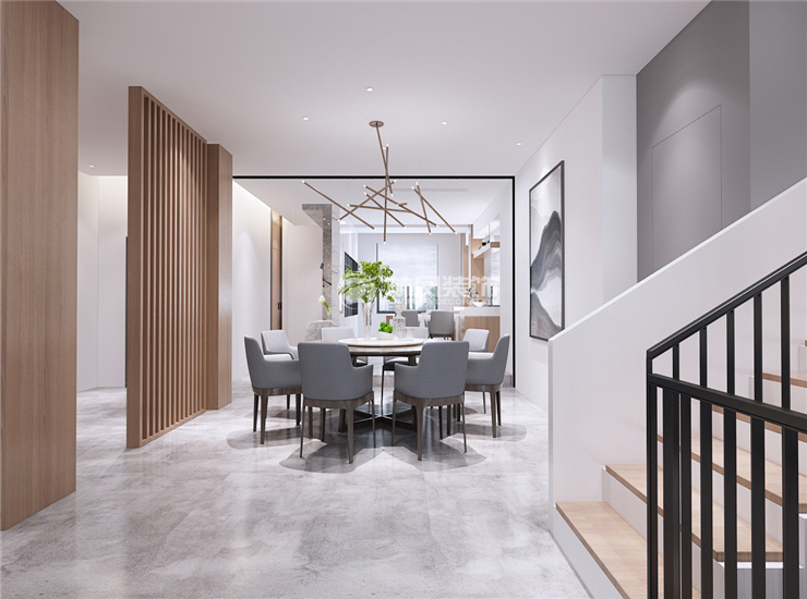 餐廳的位置兼顧了客廳和廚房的中心。餐廳的空間使用了簡潔的圓桌代替了普通的方桌。餐椅的搭配兼顧了客廳的沙發(fā)顏色做了搭配。所有的動線空間也都做了更好的銜接。