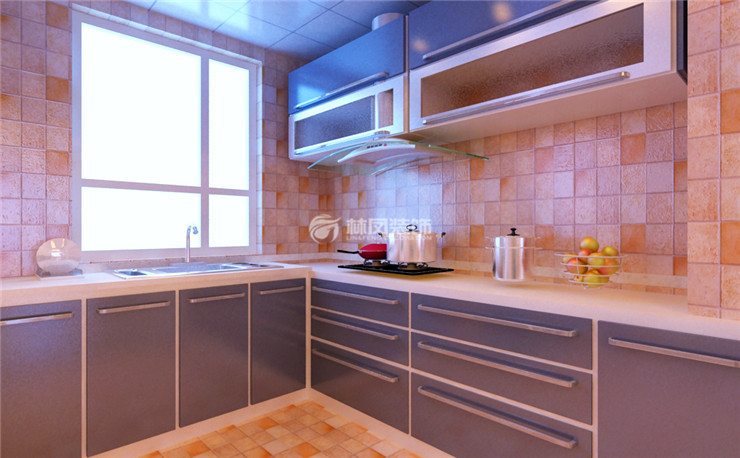 廚房以藍(lán)色櫥柜搭配灰色亞光墻磚,臺(tái)面采用白色,使得廚房為一家人增加一個(gè)能一起下廚的快樂(lè)時(shí)光。
