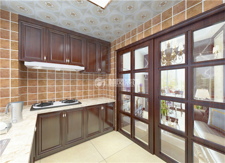 根據(jù)廚房結(jié)構(gòu)選擇做U型櫥柜,三面靠墻的設計可以使廚房的空間發(fā)揮到極致,并且功能分區(qū)布局細致,擁有相當充足的空間作為儲藏和收納,仿古墻磚搭配實木漆面櫥柜,更顯傳統(tǒng)美式復古風采。